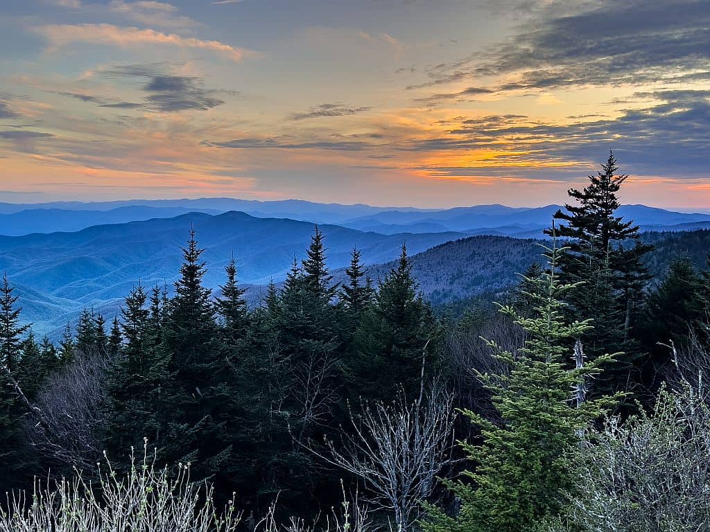 Zachody słońca w Great Smoky Mountains są wyjątkowe nie tylko ze względu na wysokość, ale też na warstwową strukturę gór, które układają się jak fale. Każda kolejna jest coraz bardziej zamglona i coraz bardziej niebieska.